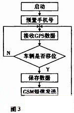 自動(dòng)跟蹤系統(tǒng)軟件由界面程序、信號(hào)處理程序和控制信號(hào)輸出程序等三部分組成。信號(hào)處理程序?qū)崿F(xiàn)了單片機(jī)對(duì)GPS信號(hào)的采集、解析等以及通過(guò)GSM網(wǎng)絡(luò)向用戶發(fā)送車(chē)輛定位信息等,是軟件程序的重點(diǎn);界面程序主要完成手機(jī)號(hào)設(shè)置、鍵盤(pán)處理、液晶顯示等,實(shí)現(xiàn)了與用戶良好的溝通;控制信號(hào)程序?qū)崿F(xiàn)對(duì)GSM信號(hào)的接收與分析,完成對(duì)車(chē)輛的點(diǎn)火開(kāi)關(guān)的控制;其軟件總框圖如圖3所示。