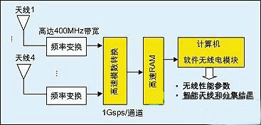 VIPER被設(shè)計(jì)成在最少的RF硬件條件下,在軟件中實(shí)現(xiàn)處理功能。圖4給出了接收器硬件的模塊示意圖。執(zhí)行單階下變頻后,在四個信道的每一個信道的IF信號以每秒1G的采樣率被采樣。所采集樣本信號存儲在RAM中,并由計(jì)算機(jī)處理。