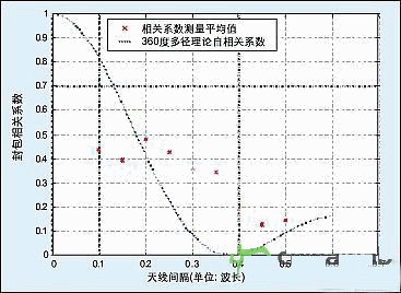圖5:在市區(qū)、非LOS環(huán)境下,空間分集測量中封包(envelope)相關(guān)系數(shù)與天線間隔關(guān)系