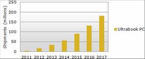 雖然最近兩年由于超薄筆電高售價(jià)與超薄顯示器供應(yīng)限制等因素,市場(chǎng)將無(wú)法快速增長(zhǎng);但是未來(lái)作為新型計(jì)算機(jī)產(chǎn)品,超薄筆電更時(shí)尚的設(shè)計(jì)、實(shí)時(shí)啟動(dòng)和電池待機(jī)時(shí)間長(zhǎng)等特性,有望于在預(yù)測(cè)后期拉動(dòng)市場(chǎng)需求。到2017年,筆記型計(jì)算機(jī)預(yù)計(jì)將出貨4億3千2百萬(wàn)臺(tái)。