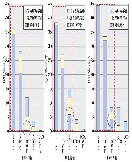 圖2:大容量產(chǎn)品的所占比例按照不同的靜電容量對(duì)電容器的總需求進(jìn)行了統(tǒng)計(jì),分別明確了片狀獨(dú)石陶瓷電容器、鋁電解電容器、鉭電解電容器各自所占比例。