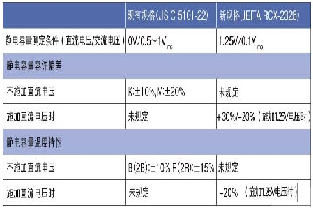 在靜電容量的測(cè)定上,新規(guī)格改為在施加1.25V直流電壓和0.1Vrms交流電壓的狀態(tài)下對(duì)容量進(jìn)行測(cè)定。而原來的“JIS C 5101-22”規(guī)格并不要求施加直流電壓,只是要求在施加0.5~1Vrms交流電壓的狀態(tài)下對(duì)容量進(jìn)行測(cè)定。