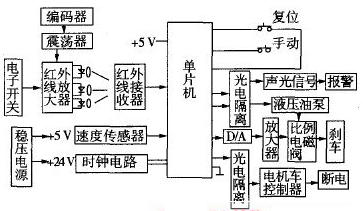 紅外線發(fā)射單元包括編碼調(diào)制器、載波振蕩器、電子開關(guān)、發(fā)射管、聚光透鏡等組成;紅外接收單元為紅外集成一體化接收頭;主控制單元由單片機(jī)、時鐘電路、復(fù)位電路、手動操作鍵盤、D/A轉(zhuǎn)換器組成;執(zhí)行單元由光電隔離器、模擬放大器組成;聲光報警單元由電機(jī)車電笛和閃光報警電路構(gòu)成;液壓制動單元由速度傳感器、液壓油泵、比例電磁閥、溢流閥、液壓油缸、剎車推桿等組成。