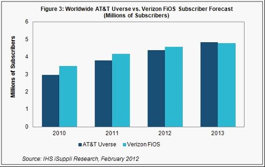 據(jù)IHS Screen Digest的研究報(bào)告,2011年第四季度美國電話電報(bào)公司(AT&T)的Uverse服務(wù)新增用戶數(shù)量,多于對手Verizon的FiOS服務(wù)。這是AT&T在競爭激烈的付費(fèi)電視領(lǐng)域連續(xù)第10個(gè)季度戰(zhàn)勝Verizon。