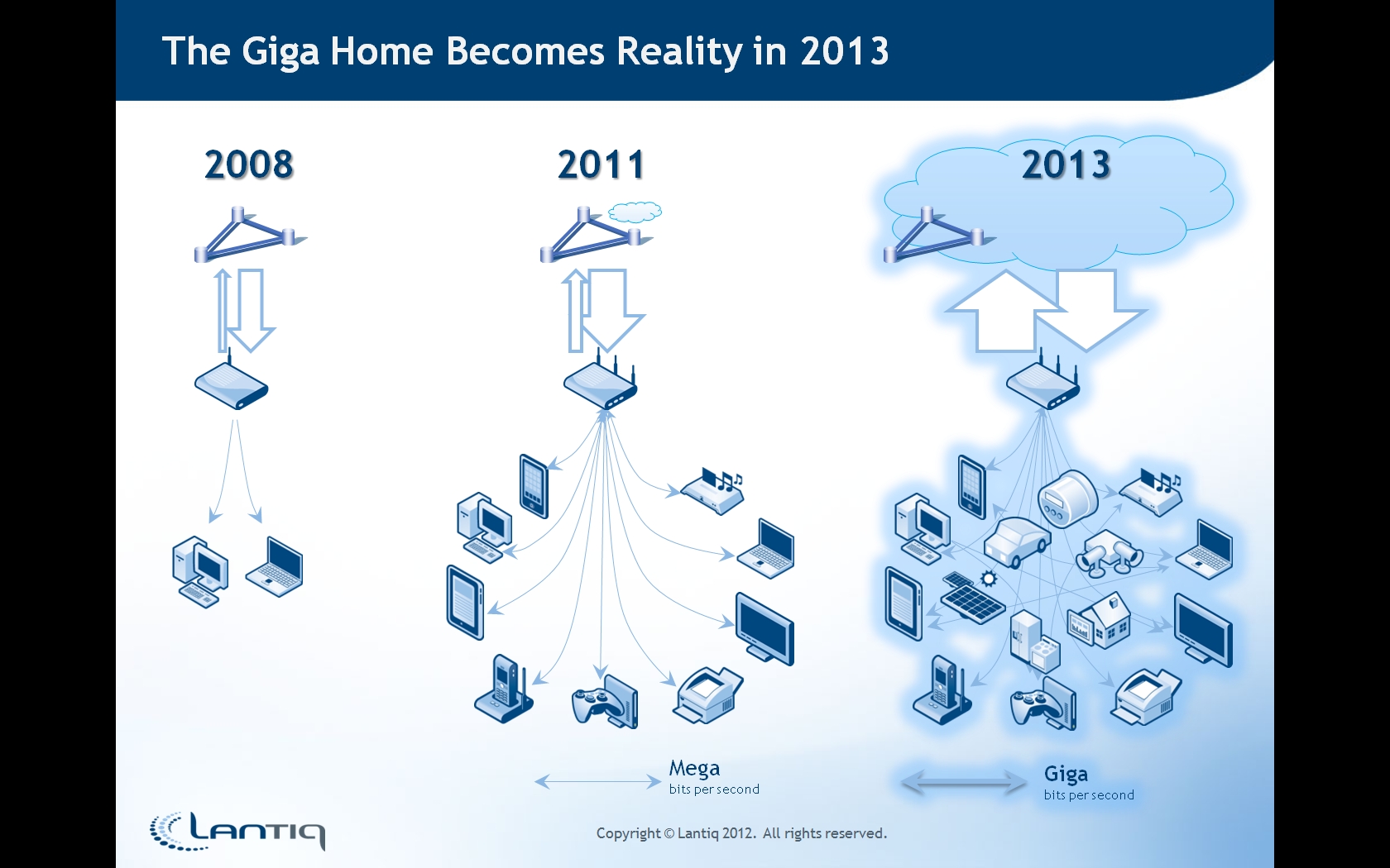 在家庭之中,對(duì)帶寬的需求持續(xù)不斷地增長(zhǎng)。平板電腦、智能手機(jī)、PC、網(wǎng)絡(luò)存儲(chǔ)設(shè)備(NAS)、電視和游戲機(jī)都需要可靠且快速的高數(shù)據(jù)流量。所有的這些設(shè)備都相互連接并聯(lián)到互聯(lián)網(wǎng)中,當(dāng)添加了云計(jì)算和HDTV/IPTV流媒體服務(wù)時(shí),寬帶網(wǎng)絡(luò)中的數(shù)據(jù)需求將爆發(fā)。