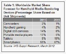 據(jù)IHS iSuppli公司的消費(fèi)平臺(tái)專題報(bào)告,憑借多種多樣的功能與特點(diǎn),智能手機(jī)和平板電腦等多用產(chǎn)品將繼續(xù)侵蝕數(shù)碼相機(jī)等其它專用消費(fèi)電子產(chǎn)品的銷售,最終在2015年導(dǎo)致這些傳統(tǒng)的媒體再現(xiàn)(media-rendering)設(shè)備市場(chǎng)永久衰落。