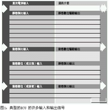 ECU 利用許多信號(hào)來(lái)監(jiān)控汽車(chē)及其環(huán)境,進(jìn)而管理與控制引擎和輔助設(shè)備,以達(dá)到最佳的運(yùn)作狀態(tài)。圖1摘要了典型的ECU 的許多輸入和輸出信號(hào)。