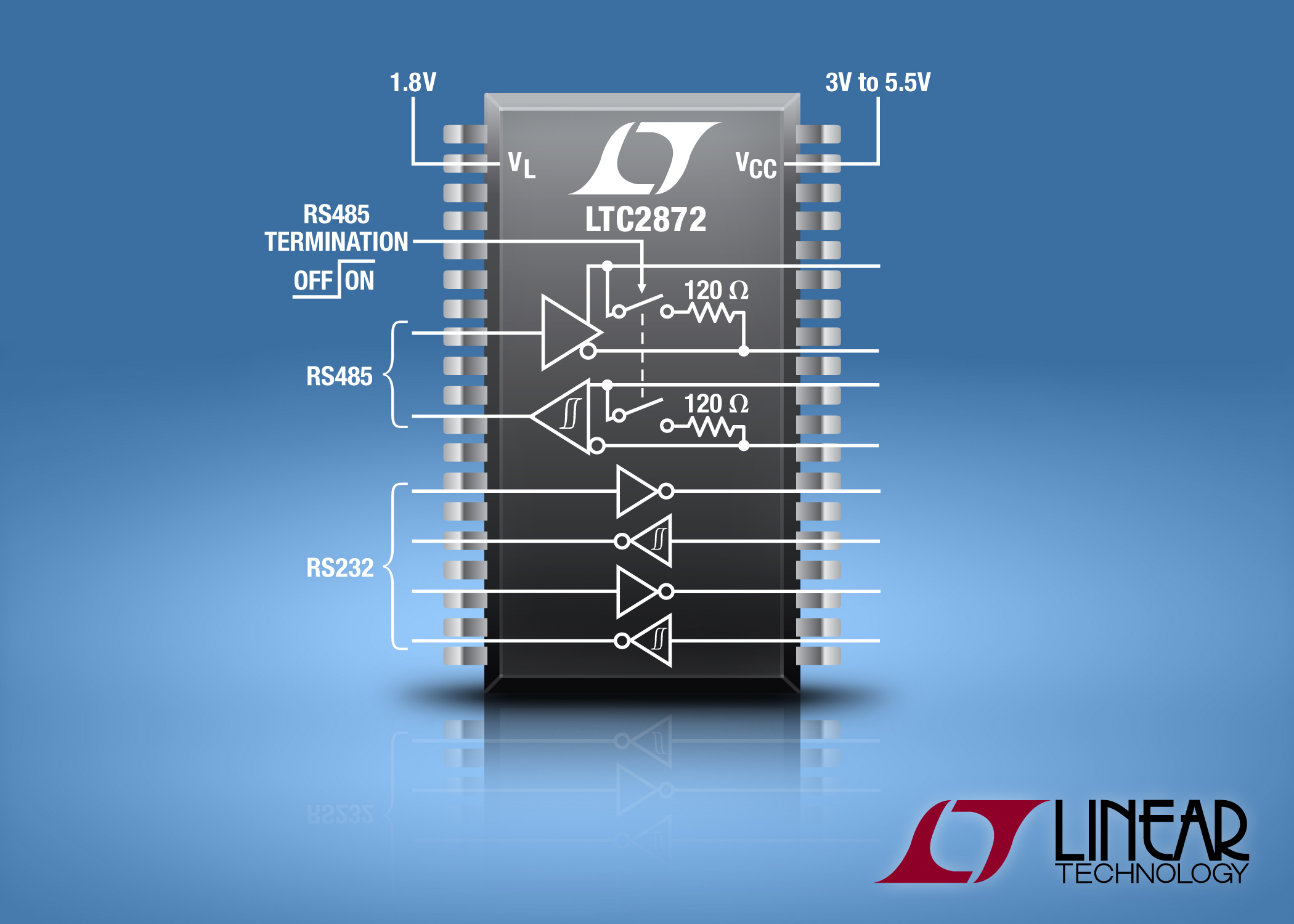 凌力爾特公司 (Linear Technology Corporation) 推出適用于 3.3V 和 5V 系統(tǒng)并具可通斷集成型終端的多協(xié)議收發(fā)器 LTC2872。RS485 系統(tǒng)需要在通信總線的末端上布設一個終端電阻器,以最大限度地減少信號反射。LTC2872 集成了引腳控制型終端電阻器以簡化接口重新配置,從而免除了外部電阻器和控制繼電器。終端電阻器在啟用時可自動接通或斷開,以與收發(fā)器所選擇的協(xié)議 (RS232 或 RS485) 相匹配。該器件還擁有高 ESD 防護能力:在收發(fā)器總線引腳上可達 ±16kV HBM (在斷電或運作時)。LTC2872 可配置為采用共用 I/O 線路的 4 個 RS232 單端收發(fā)器或 2 個 RS485 差分收發(fā)器,或者此二者的組合,從而減少了多協(xié)議網絡的組件數目,并提供運行中的可配置性。