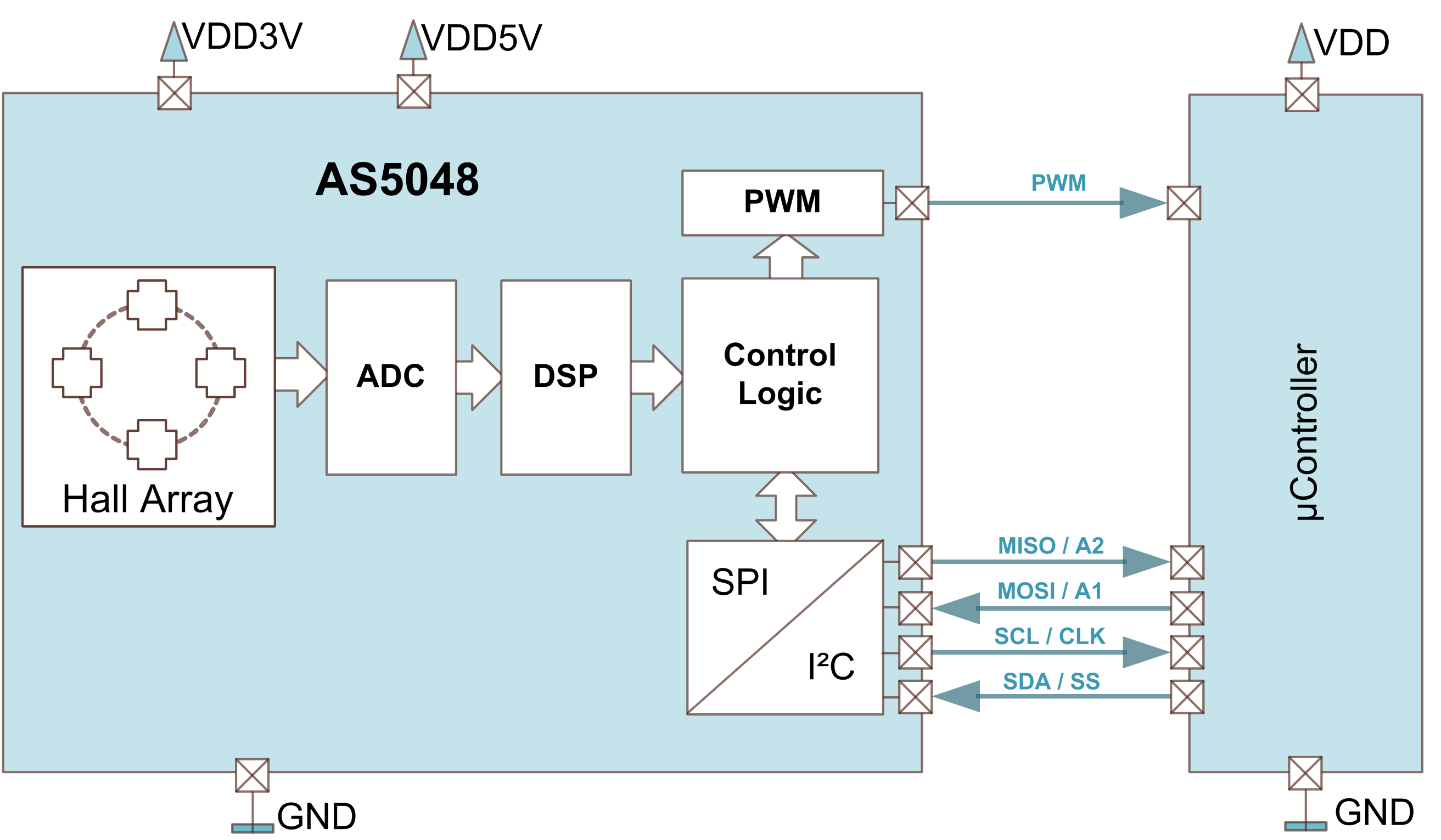 產(chǎn)品所含的內(nèi)部電壓調(diào)壓器使AS5048能在3.3伏或5伏電壓下運(yùn)作。產(chǎn)品采用14-pin TSSOP封裝。多個(gè)器件可以以 菊鏈的方式串接在一起使用。