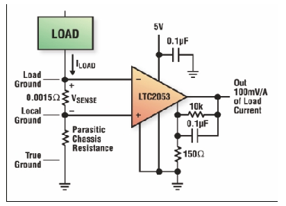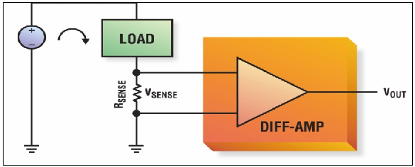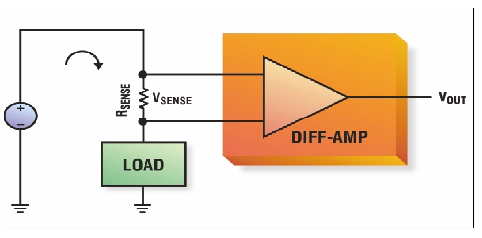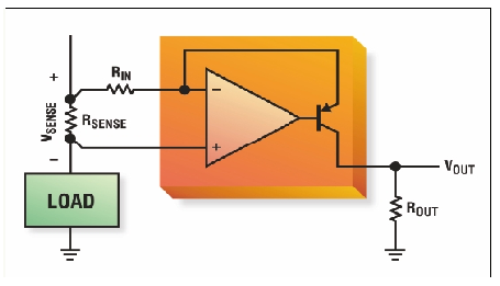 理想情況下,電流和電壓檢測(cè)都不應(yīng)影響所連接的負(fù)載。這意味著電壓檢測(cè)器件應(yīng)該具有近似無窮大的輸入阻抗,這樣才能確保對(duì)負(fù)載沒有明顯的分流。相反,電流檢測(cè)應(yīng)該具有近似為零的輸入阻抗,這樣才能確保加到負(fù)載上的電壓不會(huì)明顯降低。高端電流檢測(cè)電路(放大器+電阻器)應(yīng)滿足這兩項(xiàng)要求。用來檢測(cè)RSENSE上電壓的放大器必須具有高輸入阻抗,而用來檢測(cè)負(fù)載電流的電阻則必須非常小。