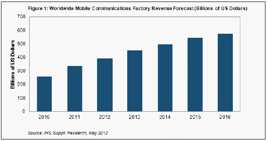 上述預(yù)測數(shù)據(jù)由無線通信產(chǎn)業(yè)各領(lǐng)域中的OEM廠商的總體工廠營業(yè)收入構(gòu)成,包括手機(jī)、媒體平板和移動基礎(chǔ)設(shè)備等主要領(lǐng)域,以及無線路由器、無繩電話、電池充電器和灰市手機(jī)等輔助領(lǐng)域。