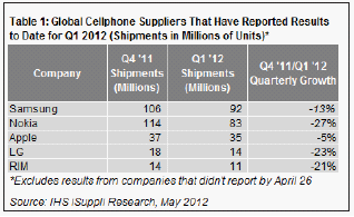 據(jù)IHS iSuppli公司的DRAM市場簡報(bào),爾必達(dá)第一季度營業(yè)收入比2011年第四季度增長1%,占據(jù)大約12.6%的市場份額,排名升至第三。雖然其增長幅度可能顯得很小,但爾必達(dá)的表現(xiàn)優(yōu)于整體DRAM市場。第一季度整體DRAM市場的營業(yè)收入為62億美元,比2011年第四季度的65億美元下降4%,如表1所示。爾必達(dá)的表現(xiàn)也優(yōu)于緊隨其后的美光。美光的第一季度營業(yè)收入環(huán)比下降3%,排名下降一位至第四。