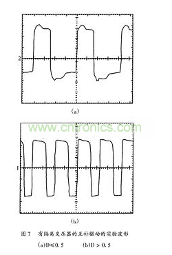 6(b)為占空比大于0.5時適用的驅動電路,其中Z2為穩壓二極管,此時副邊繞組負電壓值較大,Z2的穩壓值為所需的負向電壓值,超過部分電壓降在電容C2上,其實驗波形見圖7(b)。