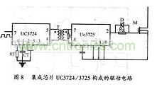 其中UC3724用來產生高頻載波信號,載波頻率由電容CT和電阻RT決定。一般載波頻率小于600kHz,4腳和6腳兩端產生高頻調制波,經高頻小磁環變壓器隔離后送到UC3725芯片7、8兩腳經UC3725進行解調后得到驅動信號,UC3725內部有一肖特基整流橋同時將7、8腳的高頻調制波整流成一直流電壓供驅動所需功率。