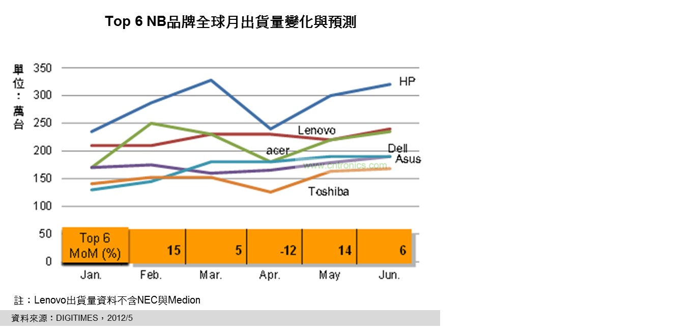 DIGITIMES Research資深分析師兼主任簡佩萍分析,品牌與代工廠NB月出貨量方面,在歷經(jīng)低迷的4月后,5月搭配英特爾(Intel)新品NB鋪貨效應(yīng),出現(xiàn)兩位數(shù)的月成長幅度;但整體而言仍較先前預(yù)測(cè)的出貨成長緩和許多,尤其對(duì)6月份的出貨展望,全球前6大品牌普遍保守,預(yù)期前6大品牌月NB出貨量成長幅度也將因此驟降至個(gè)位數(shù)。