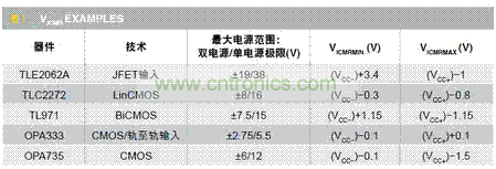 表1是德州儀器公司幾款運放及其VICMR。最大電源區(qū)間欄中描述了雙電源和單電源的極限。表中可以明顯看到,不同運放的輸入區(qū)間VICMR各不相同。根據器件的類型,VICMR可能進入或超出電源軌。因此,永遠不能假定某個運放可以接受某個輸入信號區(qū)間,除非驗證了數據表中的規(guī)格。