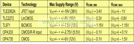 值得一提的一種寬輸入范圍特例是“軌到軌輸入運算放大器”。盡管,顧名思義,它是一種輸入涵蓋整個電源軌范圍的運算放大器,但并非所有軌到軌輸入器件都如許多人設想的那樣涵蓋整個電源范圍。許多軌到軌輸入運算放大器的確涵蓋了整個電源范圍(例如:表1中的OPA333等),但有一些則沒有全覆蓋,而其描述對人具有一定的誤導性。另外,檢查產品說明書中的規定輸入范圍至關重要。
