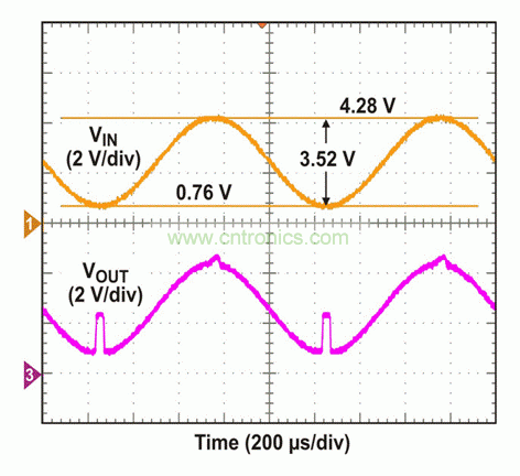為了測試該電路,我們將VCC/2 = 5V DC偏移的300 Hz正弦波應用于輸入端。在VOUT出現變化以前,一直對AC幅值進行調節。如圖4所示,當應用10 Vp-p輸入時,VOUT在正軌附近出現一個經削波的信號,而非負軌附近。如果輸入超出VCC – 0.8V(本例中為9.2V),這種正軌附近出現的非理想行為是我們能夠預計到的。9.2V以下VIN電平和低至0V時,VOUT顯示出正確的波形,正如我們所預期的那樣。