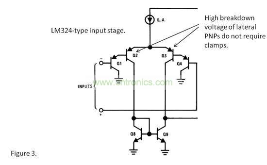 使用橫向PNP 輸入晶體管的通用運算放大器一般沒有輸入鉗位,例如:LM324" target="_blank" title="Link to Product Folder">LM324、LM358" target="_blank" title="Link to Product Folder">LM358、OPA234" target="_blank" title="Link to Product Folder">OPA234、OPA2251" target="_blank" title="Link to Product Folder">OPA2251 和OPA244" target="_blank" title="Link to Product Folder">OPA244。這些運算放大器一般為“單電源”類型,其意味著它們擁有一個擴展至負電源端(或者稍低)的共模范圍。輸入偏置電流為一個負數時,表示輸入偏置電流自輸入引腳流出。這時,我們通常可以認定它們為這類運算放大器。但是,需要注意的是,使用PNP 輸入的高速運算放大器一般有輸入鉗位,而這些PNP 是一些具有更低擊穿電壓的垂直PNP。