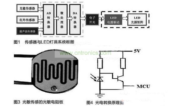 傳感器作為信號(hào)采集和機(jī)電轉(zhuǎn)換的器件,其機(jī)電技術(shù)已相當(dāng)成熟,近幾年MEMS(微機(jī)電系統(tǒng))技術(shù)興起又將傳感器技術(shù)向小型化、智能化、多功能化、低成本化大踏步邁進(jìn)。光敏傳感器、紅外傳感器等各種類型的傳感器都可與LED照明燈具組成一個(gè)智能控制系統(tǒng),傳感器將采集來的各種物理量信號(hào)轉(zhuǎn)換成電信號(hào),可以經(jīng)由集成電路化的AD(模數(shù))轉(zhuǎn)換器 、MCU(微控制器)、DA(數(shù)模)轉(zhuǎn)換器對(duì)所采集的信號(hào)進(jìn)行智能化處理,從而控制LED照明燈具開啟和關(guān)閉。人類可以籍此在MCU上設(shè)定各種控制要求,控制LED燈的開關(guān)時(shí)間、亮度、顯色、多彩變幻,從而達(dá)到省電節(jié)能的目標(biāo)。傳感器與LED燈具組成的系統(tǒng)框圖如圖1所示。目前的集成電路制造技術(shù)已經(jīng)可以將AD、DA、MCU集成在一個(gè)5mm×5mm或更小的封裝內(nèi),安裝在燈具內(nèi)既不占面積而且十分方便。