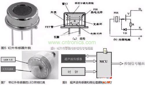 被動(dòng)式紅外傳感器有三個(gè)關(guān)鍵性的元件:菲涅爾濾光透鏡,熱釋電紅外傳感器和匹配低噪放大器。菲涅爾透鏡有兩個(gè)作用:一是聚焦作用,即將熱釋紅外信號(hào)折射在PIR上:二是將探測(cè)區(qū)內(nèi)分為若干個(gè)明區(qū)和暗區(qū),使進(jìn)入探測(cè)區(qū)的移動(dòng)物體/人能以溫度變化的形式在PIR上產(chǎn)生變化的熱釋紅外信號(hào)。一般還會(huì)匹配低噪放大器,當(dāng)探測(cè)器上的環(huán)境溫度上升,尤其是接近人體正常體溫(37℃)時(shí),傳感器的靈敏度下降,經(jīng)由它對(duì)增益進(jìn)行補(bǔ)償,增加其靈敏度。輸出信號(hào)可用來驅(qū)動(dòng)電子開關(guān),實(shí)現(xiàn)LED照明電路的開關(guān)控制。圖5是紅外傳感器外貌,圖6是紅外傳感器內(nèi)部結(jié)構(gòu)與內(nèi)部電路圖。圖7是帶紅外傳感器的LED照明燈具,這是一款E27標(biāo)準(zhǔn)螺口燈頭的燈具,其電源適用范圍是AC180V-250V(50/60Hz),紅外傳感器檢測(cè)范圍大約在3m~15m,其標(biāo)準(zhǔn)產(chǎn)品IFS-Bulb3W燈具達(dá)80lm,5W燈具達(dá)140lm.在LED光源模塊的中央部分嵌入紅外線傳感器。一旦紅外傳感器檢測(cè)到人的體溫,LED電燈泡將會(huì)在50s內(nèi)自動(dòng)開啟與關(guān)閉。適用于任何一種室內(nèi)應(yīng)用,如走廊、儲(chǔ)藏室、樓梯和大廳入口處。