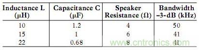 常見的濾波器設(shè)計選擇目的是為了在所需要的最高音頻頻率條件下將濾波器響應(yīng)下降減至最小以獲得最低帶寬。如果對于高達20 kHz頻率,要求下降小于1 dB,則要求典型的濾波器具有40 kHz巴特沃斯(Butterworth)響應(yīng)(以達到最大平坦通帶)。對于常見的揚聲器阻抗以及標準的L值和C值,下表給出了標稱元器件值及其相應(yīng)的近似Butterworth響應(yīng):