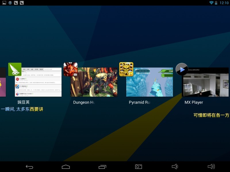 首先開啟很多個(gè)程序,如:百度視頻(在線影視客戶端),安卓市場(軟件下載平臺),計(jì)算器,聯(lián)系人程序,谷歌瀏覽器(17個(gè)網(wǎng)頁),系統(tǒng)設(shè)置,天天動聽,豌豆莢,資源管理,地牢獵手4(大型3D游戲),逃離金字塔(中型休閑游戲)。把這些程序全部最小化。