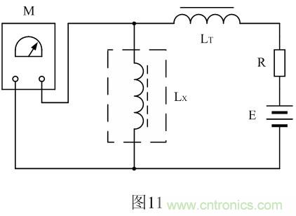 這里順便說(shuō)明,采用圖7測(cè)試時(shí)應(yīng)該注意的地方。圖7中,隔離電感LT的數(shù)值要求是測(cè)試電感Lx數(shù)值的3倍以上,并且測(cè)量高壓包初級(jí)線圈的初始電感值L0時(shí),最好也要接入電路之中。這里,隔離電感LT可選取20毫亨以上的矽鋼片直流電感,電感的鐵芯要留有氣隙;流電源可用一個(gè)穩(wěn)壓電源與一個(gè)大功率電阻串聯(lián)代替,如圖11,或用一個(gè)穩(wěn)壓電源與一個(gè)大功率晶體放大器串聯(lián)來(lái)代替,如圖12。