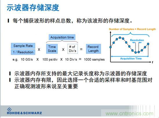 當我們測量一個信號,在不同采樣情況之下,采樣的結果誤差特別大。采樣率不夠,就是你帶寬不夠,看到的是上面的濾波的效果,所以我們要時刻提出采樣率,對于采樣率而言非常著名人提出的定理,這個老先生告訴我們,采樣率是信號的兩倍,才能保證你的信號的準確率。采樣率決定捕獲信號的時間分辨率,時間分辨率越高,可以察看的波形細節越多,但可以捕獲的時間窗口會下降。我的個人經歷是取決于你想要采集什么樣的信號,采集到什么程度。如果我測量的是發波,我就要看它的周期,你的采樣率是6個點,可能誤差只有1%。我們希望我們采的信號,感興趣的細節可以采到3到5個點,最好是5個點,當然采更多點的意義就不大了。為什么采更多點意義不大呢?因為采樣率乘采樣時間,等于示波器的產品的深度,產品太大了,會消耗你很多的時間,單位時間采的點太多,這個波形時間就太短,所以一般建議采到3到5個點。