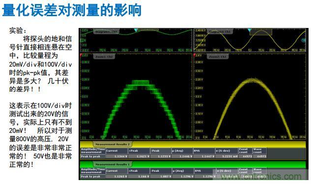 很多人覺得不可思議,為什么零伏的測試信號是30伏呢?就是這個原因。因為半導體的制作工藝的原因就是這里。當100伏/格的時候,正常測量的范圍是800伏除以256,最終結果差不多是30。這個是高壓測量的例子。所以平時用示波器測量電源的文波的時候,我們應該怎么做?如果是測量3.3伏的電流波,永遠要把探頭在地上的帽子拔掉,這個用短的地環。如果測1.8伏以下的電流波,紋波只有3豪伏以下的時候怎么做?勇敢要把探頭拔掉。為什么?因為很多探頭插上去之后,最小是1毫伏/格,直接就變成了10毫伏/格,你的示波器的量化、噪聲,加上隨機噪聲,遠遠的大于你的被測信號的噪聲,測量的結果就失去意義了。所以我們講的第一個原則就是量化最小測量誤差。