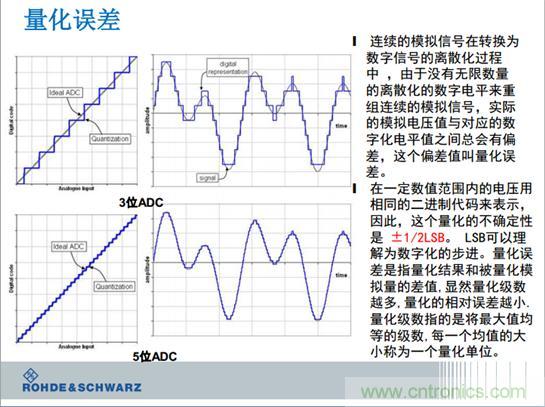 我們復習一下示波器的基本原理,把模擬信號變成影響點的各個。在數字空間里,永遠都有0和1,每一個0和1代表的電壓的大小是多少呢?通常是8位的0和1組成一個電壓。電阻里的電源的電壓是400伏,還是低壓5毫伏,都可以進行量化。每一個0和1代表的電壓是多少呢?這個是最小有利的比特位。特殊講,就是示波器的每一個路徑,示波器乘1111111,變成了11111110,最后一位從1變成0的跳變,代表了電壓的大小是多少呢?是取決于平時用示波級的量程。如果示波器1伏每格的時候,你0和1的跳變大約是30毫伏的變化。這個是示波器外邊的電壓的變化,30毫伏的電壓對示波器是沒有影響的,示波器感覺不到。這個就像平時用1厘米的刻度尺來測量頭發的時候發現無法測量,這個是基本的道理。