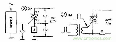 觸發(fā)電路設(shè)計不當(dāng)?shù)牡诙€例子常見于電子制作稿中,其電路見圖2a, 圖中對電路進(jìn)行簡化。其實, 無論控制系統(tǒng)完成何種控制,無論是單向還是雙向可控硅, 圖2的觸發(fā)電路是不能正常工作的。其問題在于,控制系統(tǒng)發(fā)出觸發(fā)信號UG,其參考點是共地,而可控硅T1或T2的參考點是負(fù)載熱端。實際上, 加到可控硅的觸發(fā)電壓UG是與負(fù)載端電壓UZ相串聯(lián)的。雙向可控硅究竟是T1還是T2為觸發(fā)參考點,視觸發(fā)信號的相對極性來決定的。如按圖2中標(biāo)注,T1在下,T2在上, 則UG相對于T1必須是正極性的, 且與T1的電壓同參考電位。但無論T1還是T2作參考點, 按圖2a的接法,可控硅導(dǎo)通時,UZ常近似等于Uin,如此高電壓加到觸發(fā)極G和T1之間, 將立即使觸發(fā)極被擊穿,可控硅被損壞。