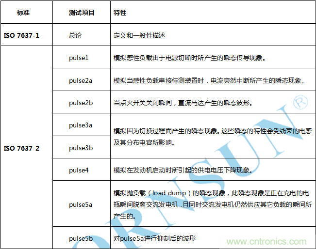 針對汽車電子自身產(chǎn)生的干擾,國際無線電干擾委員會(CISPR)對汽車電子業(yè)提出了嚴(yán)格的要求,尤其是車載收音機(jī)、數(shù)字電視、導(dǎo)航設(shè)備都是這種干擾的重災(zāi)區(qū)。所以 CISPR25:用于保護(hù)車載接收機(jī)的無線電騷擾特性的限值和測試方法,對汽車電子自身的發(fā)射狀態(tài)也有了明確的等級判定。EMS方面的測試項(xiàng)目如下所示: