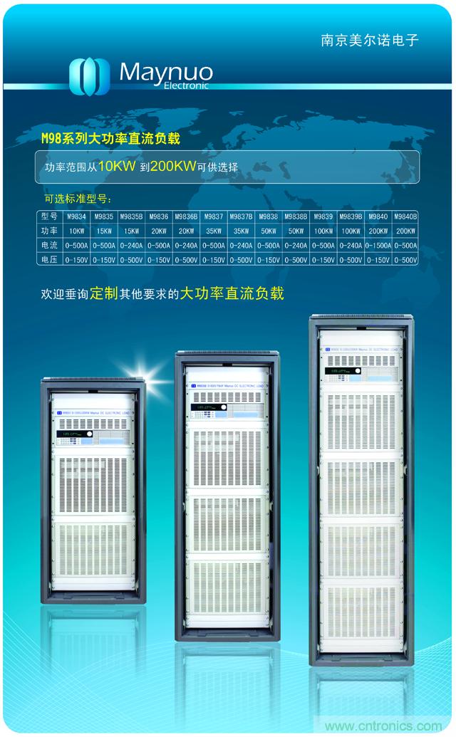 【導讀】近日,南京美爾諾推出多種型號的M98系列大功率直流負載,可提供選擇的功率范圍是10KW到200KW。如有其他要求,歡迎垂詢。快來看看吧。
