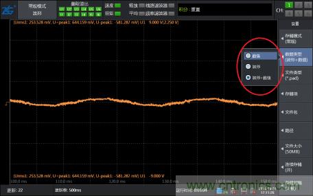 第四步,找到了想要觀察的波形幀之后,可以通過“FORM按鍵調整界面的窗口時間,對波形進行任意放大或縮小”并可以調出光標測量任意兩點的橫縱軸數據。看到這里我相信大部分人已經可以找到自己想要看的波形了。但是想要把波形存儲記錄下來怎么辦,而且想要長時間記錄可以實現嗎?不要急,PA功率分析儀還提供波形保存記錄功能。