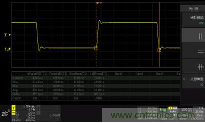 為什么會出現這種情況呢?示波器自動測量的門限是為Vtop與Vbase之間50%的位置,所以測量的結果也是以50%處為準,這種測量方法也更為科學。在用光標測量時,如果將測量點選在Vtop與Vbase的50%處,這樣測出的結果便和自動測量結果相差無幾了。如下圖,光標測量470ns,自動測量470.1ns。