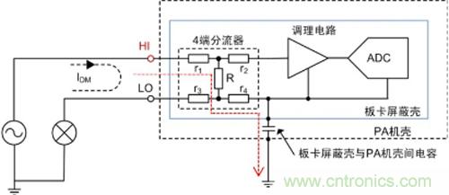 3.電流通道接入高端和低端,測量結(jié)果也不同,內(nèi)部板卡屏蔽殼與機(jī)殼間多少都會存在一些雜散電容(空間中兩個絕緣導(dǎo)體中存在電容),若電流通道接入高端,產(chǎn)生泄漏電流(圖3中紅色標(biāo)記線),因此電流測量輸入應(yīng)當(dāng)串在共模電壓較低的地方(低端)。
