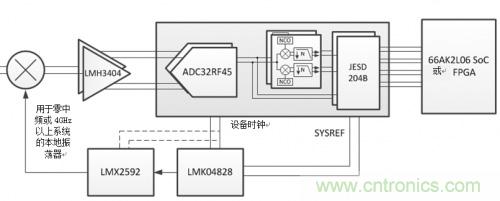 在射頻采樣無線電中,采樣時鐘的質量好壞對系統(tǒng)產生的信噪比(SNR)具有強烈影響。LMK04828是兼容JESD204B的超低噪音時鐘抖動清除器,可生成小于100fs抖動、具有射頻采樣能力的時鐘,同時具有一系列收縮或簡化系統(tǒng)的特性。因支持最多七個JESD204B裝置,LMK04828可以為多個ADC32RF45 ADC、數字模擬轉換器(DAC)、FPGA或DSP記時。LMK04828還可以生成系統(tǒng)參考(SYSREF)信號,用于JESD204B系統(tǒng)中確定性延遲,而數字和模擬延遲可幫助滿足每個JESD204B設備的關鍵計時需求。