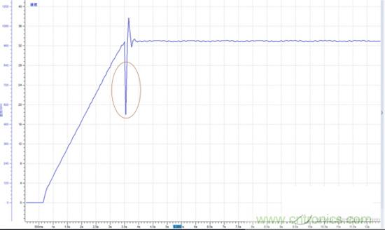 某使用PWM波形驅(qū)動(dòng)的直流電機(jī)在加速過程中存在微小抖動(dòng)情況,觀察電機(jī)轉(zhuǎn)速波形如圖3所示,開始加速后大約在3.6秒轉(zhuǎn)速出現(xiàn)一個(gè)下拉動(dòng)作。電機(jī)PWM調(diào)速原理是通過改變接通脈沖的寬度,使直流電機(jī)電樞上電壓的占空比改變,從而改變電樞電壓的平均值,控制電機(jī)的轉(zhuǎn)速。因此基本可以確定這個(gè)轉(zhuǎn)速下拉動(dòng)作是由于PWM波占空比出現(xiàn)異常引起的。