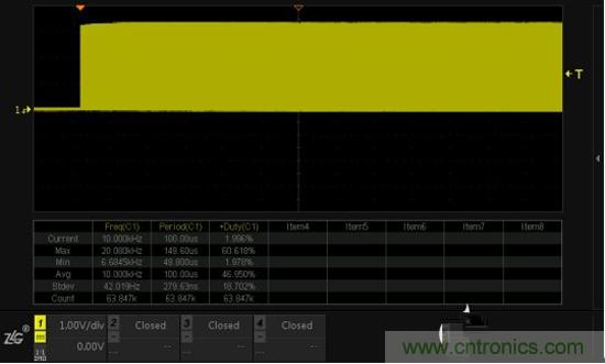 ZDS4000系列示波器不僅僅可以分析占空比趨勢(shì),還可以分析周期和頻率變化趨勢(shì),結(jié)合強(qiáng)大的測(cè)量功能。