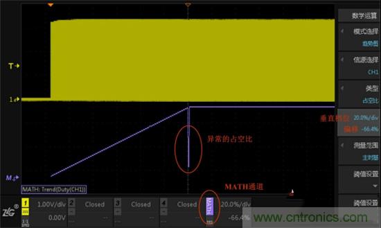 這個(gè)時(shí)候用ZDS4000系列示波器新開發(fā)獨(dú)特的占空比趨勢(shì)測(cè)量功能,將每一個(gè)PWM波的占空比顯示在屏幕上,點(diǎn)擊示波器數(shù)學(xué)運(yùn)算Math按鍵,模式選擇趨勢(shì)圖,類型選擇占空比,示波器會(huì)自動(dòng)檢測(cè)PWM波的周期和閾值,無需過多設(shè)置,就可以快速出波形,波形如圖5所示。屏幕上除了通道1,還多了MATH通道,顏色為紫色,MATH通道顯示的即是占空比趨勢(shì),可以看到占空比緩慢遞增后大約在屏幕中間位置出現(xiàn)了異常。和通道1一樣,MATH通道也可以調(diào)節(jié)垂直檔位和偏移。