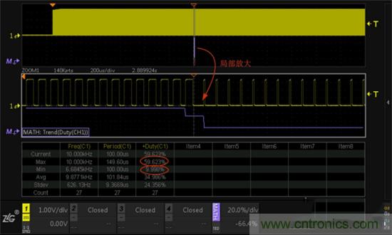 定位到占空比異常位置后,開啟示波器縮放模式下ZOOM多窗口顯示功能,對(duì)信號(hào)進(jìn)行局部放大,如圖6所示,可以清晰的看到占空比異常的細(xì)節(jié),同時(shí)開啟對(duì)ZOOM1窗口數(shù)據(jù)的測(cè)量和統(tǒng)計(jì),可以看到占空比從正常的59.62%變?yōu)?.99%左右。