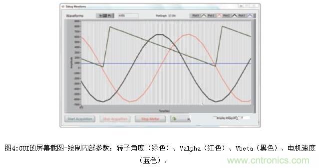 基于SmartFusion2 SoC FPGA的多軸電機(jī)控制解決方案通過(guò)USB連接至主機(jī)PC,并與圖形用戶界面(GUI)通信,進(jìn)行啟動(dòng)/停止電機(jī),設(shè)置電機(jī)速度值和其他系統(tǒng)參數(shù),描繪多達(dá)四個(gè)系統(tǒng)變量,例如電機(jī)速度、電機(jī)電流和轉(zhuǎn)子角度(圖4)。