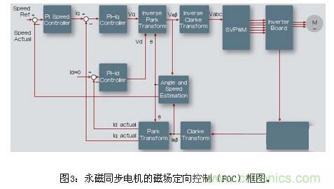 (1)電機(jī)控制IP模塊。圖3為無(wú)傳感器磁場(chǎng)定向控制算法,這一部分將會(huì)討論這些模塊,它們作為IP核提供。