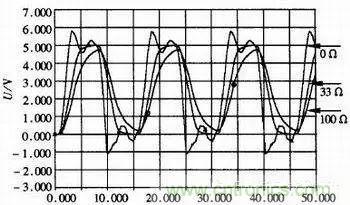 圖中分別標出了匹配電阻是0Ω、33Ω、100Ω時接收端的信號波形。從波形看出,0Ω時波形有很大的上沖和下沖現象,信號最差;100Ω時信號衰減較大,方波幾乎變成了正弦波;而匹配電阻是33Ω時波形較好。理想的匹配電阻值,可以利用軟件的terminatorWizard工具,自動根據器件的參數模型算出最佳匹配電阻為33.6Ω,實際應用中可以選用33Ω。利用仿真和器件的IBIS模型,可以很精確地知道匹配電阻值的大小,從而使信號完整性具有可控性。