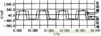 在實際的PCB布線時,如果由于產品結構的需要,不能縮短信號線長度時,應采用差分信號傳輸。差分信號有很強的抗共模干擾能力,能大大延長傳輸距離。差分信號有很多種,如ECL、PECL、LVDS等,表1列出LVDS相對于ECL、PECL系統的主要特點。LVDS的恒流源模式低擺幅輸出使得LVDS能高速驅動,對于點到的連接,傳輸速率可達800Mbps,同時LVDS低噪聲、低功耗,連接方便,實際中使用較多。LVDS的驅動器由一個通常為3.5mA的恒流源驅動對差分信號線組成。接收端有一個高的直流輸入阻抗,幾科全部的驅動電流流經10Ω的終端電阻,在接收器輸入端產生約350mV電壓。當驅動狀態反轉時,流經電阻的電流方向改變,此時在接收端產生有效的邏輯狀態。圖5是利用LVDS芯片DS90LV031、DS90LV032把信號轉換成差分信號,進行長距離傳輸的波形圖。在仿真時設置仿真頻率為66MHz理想方波,傳輸距離為508mm,差分對終端接100Ω負載匹配傳輸線的差分阻抗。從仿真結果看,LVDS接收端的波形除了有延遲外,波形保持完好。