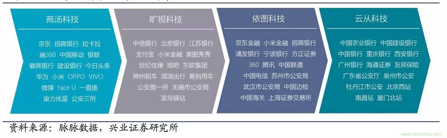 自研技術方面,谷歌在2012年獲得人臉識別解鎖手機的專利;蘋果獲得相應專利的時間為2015年。在國內市場,BAT也在人工智能領域奮力競爭。資本方面,把深度學習算法運用到人臉識別上目前走在最前列的是百度等互聯網公司。同時,很多創業型企業技術也不弱,比如商湯科技(Sense Time)、曠視科技、依圖科技、云從科技四家獨角獸公司。這些公司無論是從技術上還是從應用能力上都 相對成熟,獲得了資本市場的高度重視。下面對比四家人臉識別獨角獸公司的技術和應用場景。