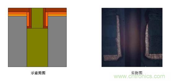(2)孔內板電銅薄孔無銅―――表銅板電層均勻正常,孔內板電層從孔口至斷口處呈遞減拉尖趨勢,且斷口處一般處于孔的中間部位,斷口處銅層左