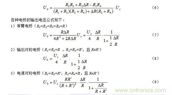一般來(lái)說(shuō),等臂電橋和輸出對(duì)稱電橋的輸出電壓比電源對(duì)稱電橋高,因此靈敏度也高,但電源對(duì)稱電橋的測(cè)量范圍大,可以通過(guò)選擇R和R′ 來(lái)擴(kuò)大測(cè)量范圍,R和R′ 差距愈大,測(cè)量范圍也愈大。