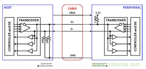 2. 它必須管理USB電纜上的雙向通信,確保其收發(fā)器在適當?shù)臅r候進行發(fā)送和接收,并精確重現(xiàn)所有驅(qū)動和空閑狀態(tài)。若要精確重現(xiàn)空閑狀態(tài),它必須在其上游側配置上拉電阻,以模擬連接下游外設的上拉電阻狀態(tài)。它在下游側也需配置下拉電阻。必須監(jiān)控總線上表示總線空閑、分組開始和分組結束的信號,以便正確響應這些狀況。
